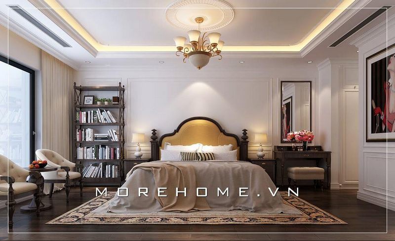 Đặc trưng của thiết kế nội thất phòng ngủ Master tân cổ điển là sự cầu kỳ tập trung ở đường nét đầu giường bởi lối trang trí hoàng gia