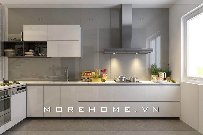 Thiết kế nội thất phòng bếp sử dụng tone màu trắng chủ đạo tạo nên không gian sạch sẽ, sang trọng và tiện nghi cho người nội trợ
