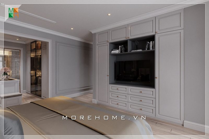 Morehome xin giới thiệu cho bạn mẫu phòng ngủ phong cách tân cổ điển với phòng thay đồ ở trung tâm giúp liên kết không gian phòng ngủ với phòng tắm, tận dụng triệt để diện tích sử dụng và mang lại sự thuận tiện cho sinh hoạt hàng ngày.