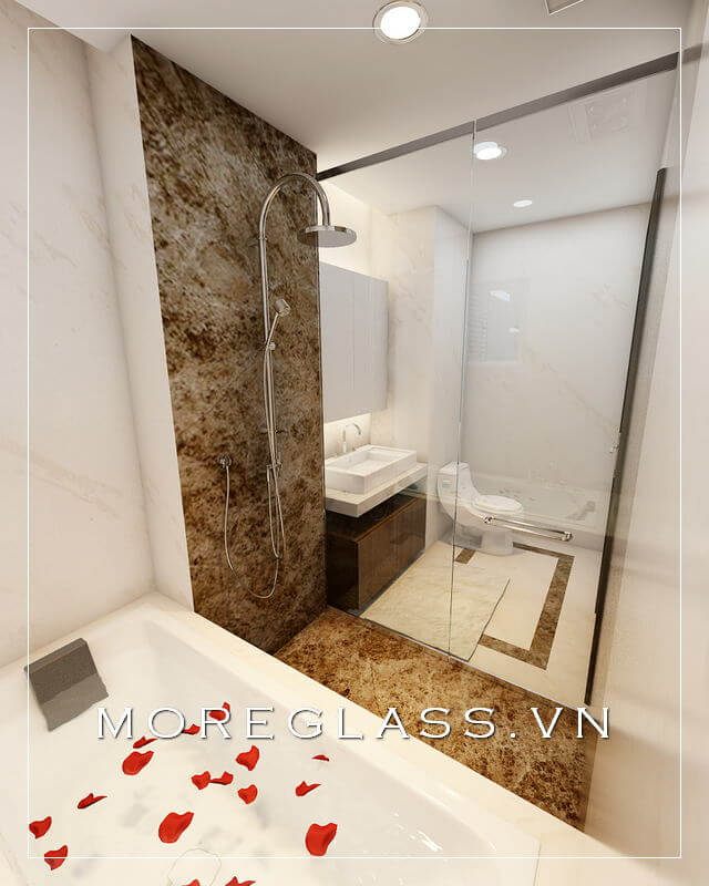 Mẫu thiết kế phòng tắm đẳng cấp được trang bị bằng đá tự nhiên, ốp tường màu trắng vân mây cao cấp sẽ cuốn hút tất cả ánh nhìn.
